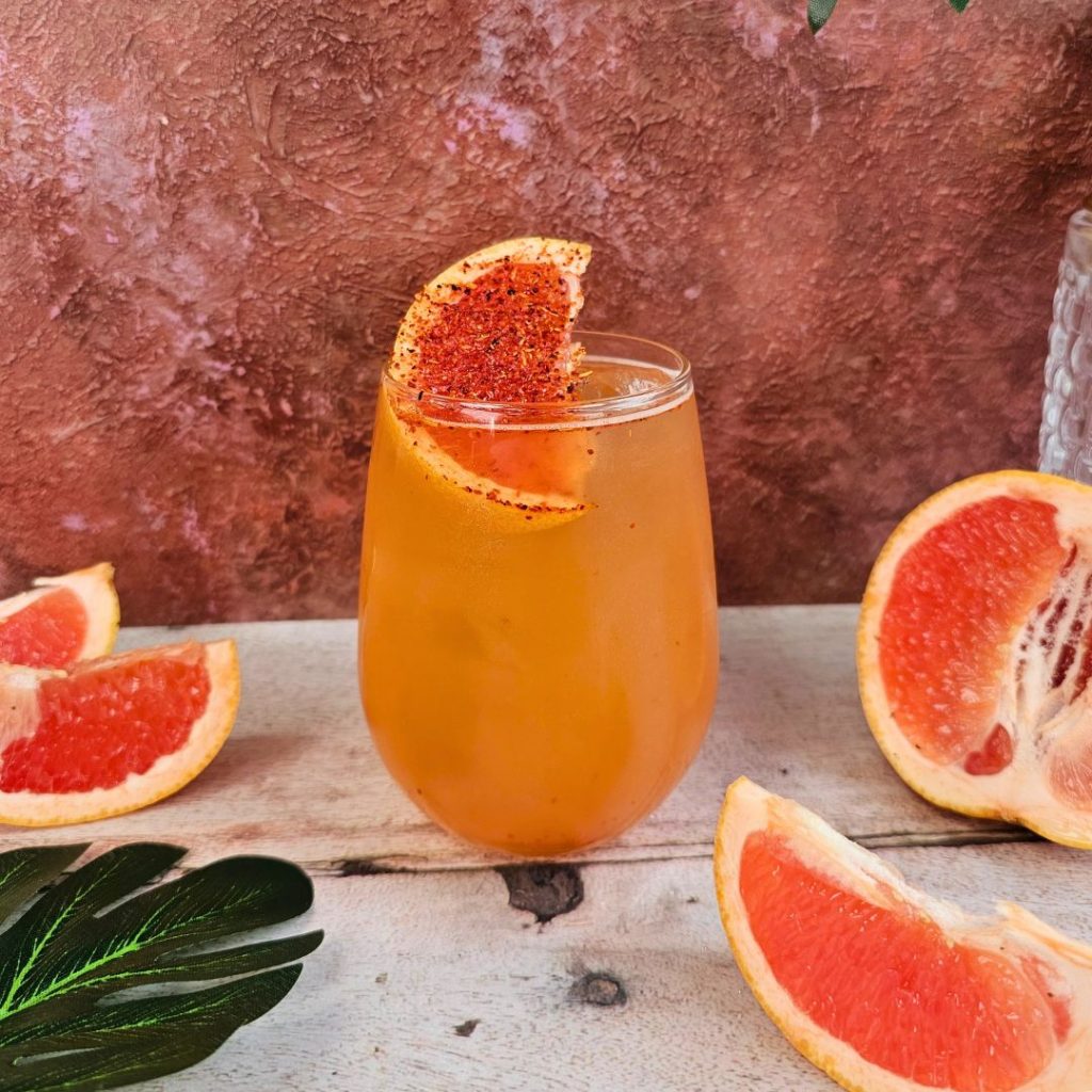 3. To serve, sprinkle tajin over a wedge of red grapefruit and add to the glass.
