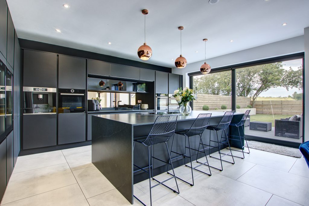 The kitchen is complimented with a range of eye-catching features including quartz worktops, tiled flooring, aluminium sliding doors and houses a range of integrated appliances including two wine coolers, a coffee machine, a double oven, two plate warming drawers, a microwave, dishwasher and induction hob with downdraft extractor. Leading off the kitchen is a unique six-seat home cinema with high end equipment including projector, screen and speaker system.