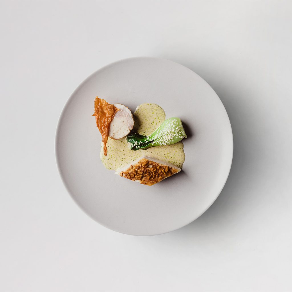 Chicken Satay, Leg Roulade, Breast, Crispy Skin, Satay Sauce, Peanut Crumble, Pak Choi Salad.